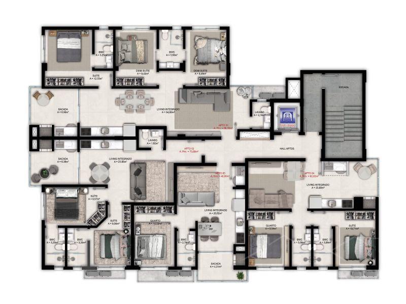 Tipo 1 com 98,36 m² privativo de apto